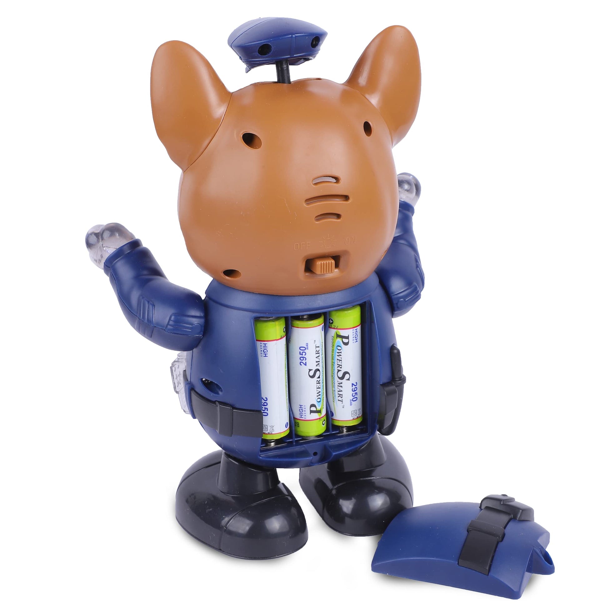 Appearance: It is a toy dog, possibly a German Shepherd breed, dressed in a dark blue police uniform with a hat and what appear to be flashing lights on its back.